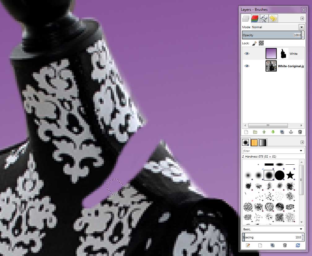 Now, you may be wondering, if I'm just making a selection by clicking and connecting the spots between the clicks using the SHIFT button, why is this any different than using the polygonal lasso? Well, it's not all that much different. The thing is, using a brush in quick mask gives me a more gentle curve because the brush is round while a polygonal lasso creates sharp points. Depending on what you're doing, one might be better than the other. For example, I don't want a pointy bust on this dress form - that's just not very attractive. I may want a crisp corner on the bag's top edge, however. If I am editing a photo of jewelry with lots of perfectly round beads, I definitely want to use quick mask because I can set the brush size to be the same size as the beads - then I only have to click on each bead once to get a perfectly round edge around each one.